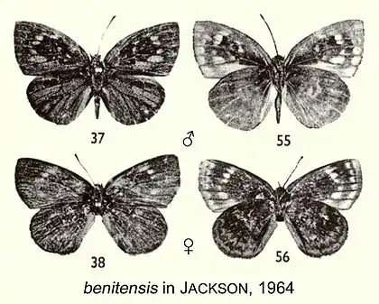 - Phytala benitensis (Holland); Jackson, 1964: 66, pls 3,4 figs 37,38,55,56; Stempffer, 1967: 85; Ackery et al., 1995: 530.