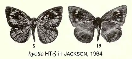 - Phytala hyetta (Hewitson); Jackson, 1964: 61, pls 1,2 figs 5,19; Stempffer, 1967: 85.