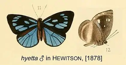 - Epitola hyetta Hewitson, 1873: 150; [1878]: Suppl. 19, pl.1b, figs 11,12.
