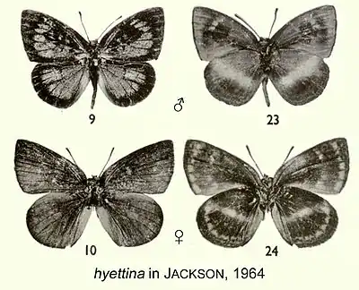 - Jackson, T.H.E. 1964. Notes on the Epitolinae, Part II. Bulletin of the British Museum (Natural History), Entomology 15: 59–80. BHL. Reference page.