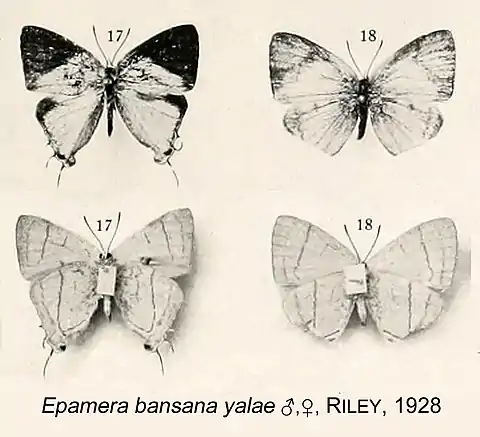 - Epamera bansana yalae Riley, 1928: 385, Pls 10,11, Figs 17,18.