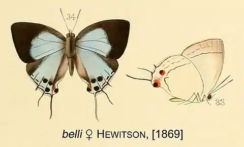 - Iolaus belli Hewitson, [1869]: 9, pl.4, figs 33,34;