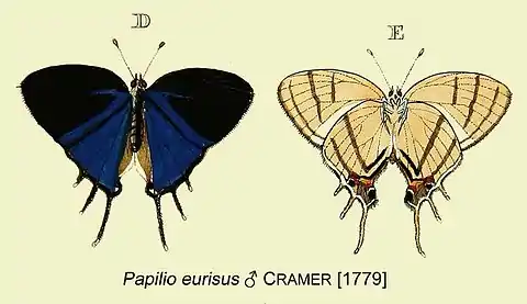 - Papilio eurisus Cramer, [1780]: 47, Pl.221, figs D,E.