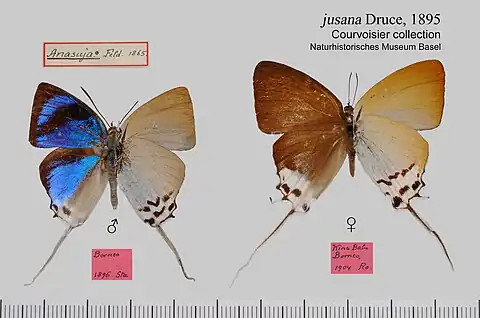 Lectotype: ♂ MNHU, "Origin. (p) [pink]/J. jusana ♂. co-type H. H. Druce (h)/Jacoona Jusana H. H. Druce (h)/Labuan Borneo Sept. or 1890. Waterstr (p)/Lectotype (p) Jacoona jusana H. H. Druce, 1895 Takanami, 1990 (h) [pink]". Designated by Takanami, 1992: 41.