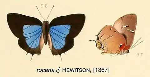 - Thecla rocena Hewitson, 1867: 91, pl.37, figs 96,97.