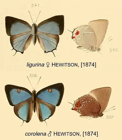 - Thecla ligurina Hewitson, [1874]: 181, pl.71, figs 541,542; Bridges, 1994: VIII.161.