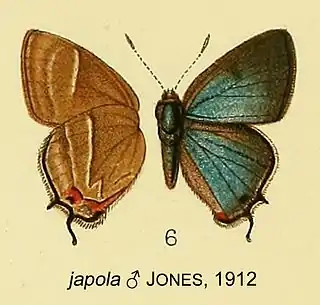 - Thecla japola Jones, 1912: 898, pl. 97, fig. 6; Bridges, 1994: VIII.233.