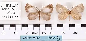 - Logania massalia Doherty, 1891: 37 '♀' recte ♂; Bingham, 1907: 304; Swinhoe, 1910: 202, pl. 618, figs. 3, 3b ♂, 3a 3c '♀' recte ♂; Evans, 1932: 213.