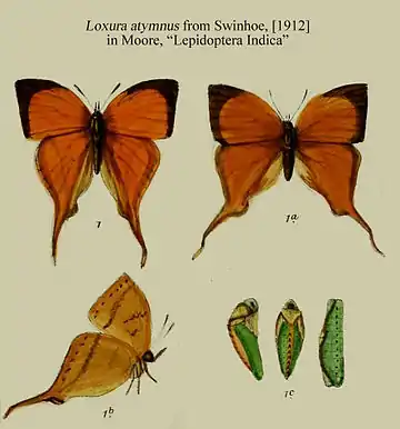 - Loxura atymnus (Stoll); Horsfield, [1829]: 121; de Nicéville, 1882: 63; Distant, 1886: 281, pl.24, fig.7; Druce, 1895: 618; Swinhoe, [1912]: 213, pl.744, figs 1,1a,1b,1c.