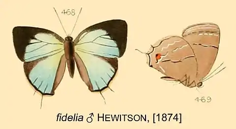 - Thecla fidelia Hewitson, 1874: 167, pl.66 figs 468,469; Bridges, 1994: VIII.176.