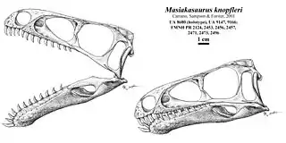 - Sampson, S.D., Carrano, M.T. & Forster, C.A. 2001. A bizarre predatory dinosaur from the Late Cretaceous of Madagascar. Nature 409(6819): 504–506. DOI: 10.1038/35054046