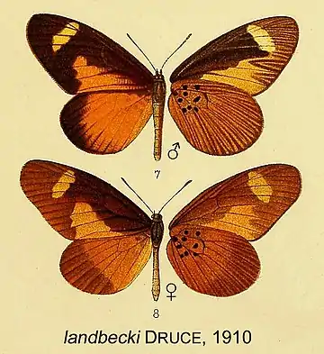 - Mimacraea landbecki Druce, 1910: 358, pl.34 figs 7,8; Libert, 2000; Williams, 2007: Mimacraeina 10.