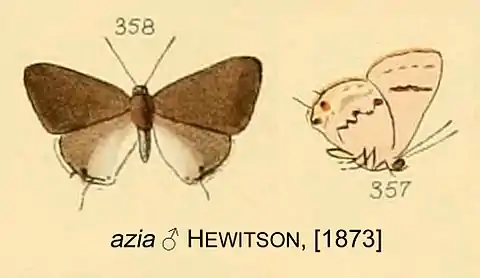 - Thecla azia Hewitson, [1873]: 144, pl.57, figs 357,358.