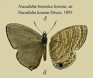 - Nacaduba berenice korene Druce; Fruhstorfer, 1916: 130; Tite, 1963: 78; D'Abrera, 1990: 348; Parsons, 1998: 423; Tennent, 2002: 83.