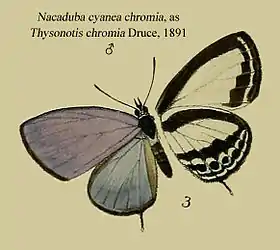 - Nacaduba cyanea chromia (Druce); Parsons, 1998: 425; Tennent, 2002: 86, pl. 45, figs 40-44.
