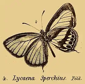 - Lycaena (Thysonotis) sperchius C. & R. Felder, 1860: 245, pl.3, fig.4. New Guinea, HT ♂ BMNH; synonymised by Parsons, 1998: 425.