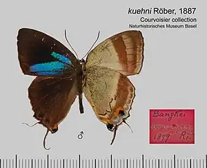 - Tajuria kuehni (Röber); Fruhstorfer, 1912: 215; Takanami, 1989: 52.