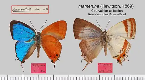 - Myrina mamertina Hewitson, 1869 (Suppl.): 2, pl. 2, figs 66, 67 ♂.