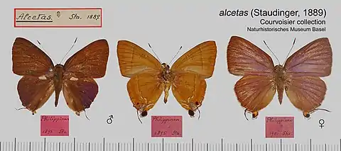 Lectotype: ♂ MNHU, "Origin. (p)/Alcetas Stgr. (h)/Palawan 88 Platen/Lectotype(p) Deudorix alcetas Staudinger, 1889 Takanami, 1986(h)". Designated by Takanami, 1989: 35.