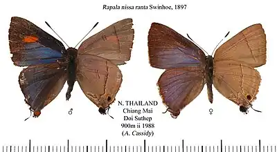 - Rapala nissa ranta Swinhoe, 1897: 409; Pinratana, 1981: 151, pl. 28, fig. 4, pl. 32, figs 20, 21, pl. 33, figs 12, 13; Huang, 2001: 81, figs 28, 55, 59, pl. 9, fig. 76; Yutaka, consulted 27.vi.2012.