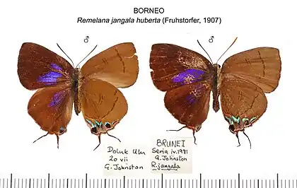 - Remelana jangala huberta (Fruhstorfer); D'Abrera, 1986: 618; Seki et al, 1991: 91, pl. 62 L333.