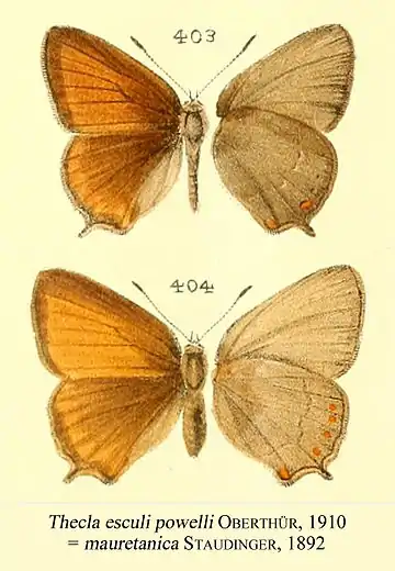 - Thecla esculi powelli (var.) Oberthür, 1910: 78, pl. 49, 403-404.