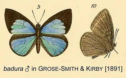 - Epitola badura Kirby, 1890: 271; Grose-Smith & Kirby, [1891]: 55, pl.13 figs 9,10; Stempffer, 1967: 87.