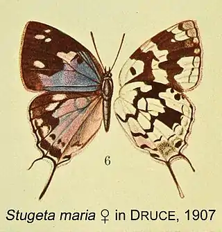 - Stugeta maria Suffert, 1904: 60; Druce, 1907: 80, pl.2, fig.6 ♀; Williams, 2007: Iolaina 139.