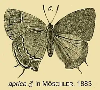- Thecla aprica Möschler, 1883: 310, pl.17 fig.6.