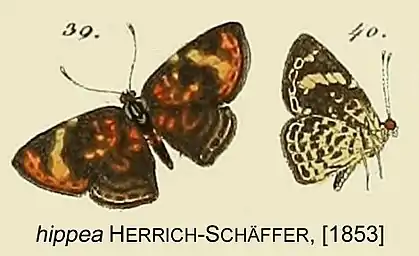 - Lemonias hippea Herrich-Schäffer, [1853]: 55, pl.12 figs 39,40.