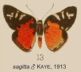 - Symmachia sagitta Kaye, 1914: 560, pl.30 fig.13. Synonymised by Lamas, 2004: 157.