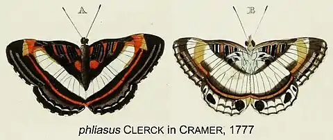 - Papilio phliasus Clerck, 1764: pl.41 figs 9,10; Cramer, 1777: 145, pl.192 figs A,B.