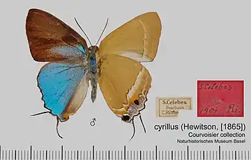 - Tajuria cyrillus cyrillus (Hewitson); Fruhstorfer, 1912: 215; Tennent & Rawlins, 2010: 9, figs 1-6.
