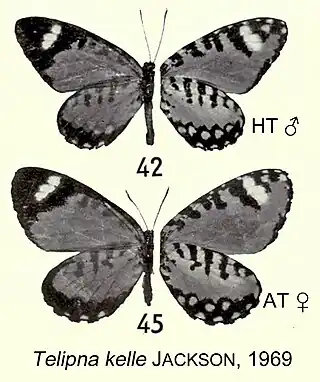 - Telipna kelle Jackson, 1969: 13, pl.3 figs 42,45. Congo: “Rép. du Congo: Moyen Congo, Kelle”. Types: BMNH. Synonymy in Libert, 2005.