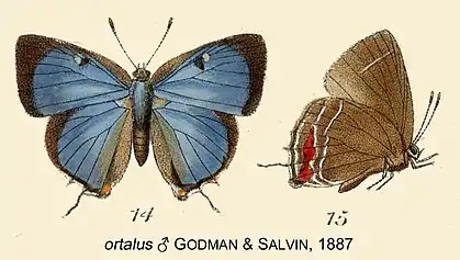 - Thecla ortalus Godman & Salvin, 1887: 52, pl.54 figs 14,15; Bridges, 1994: VIII.345.