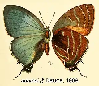 - Thecla adamsi Druce, 1909: 432, pl.12 fig.2; Bridges, 1994: 4.