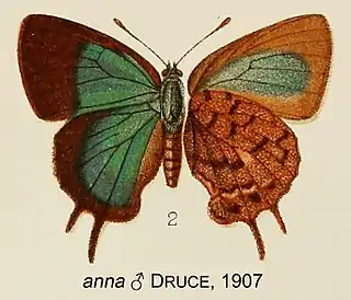 - Thecla anna Druce, 1907: 577, pl.33 fig.2; Bridges, 1994: 31.