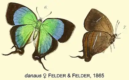 - Thecla danaus (Felder & Felder); Hewitson, [1867]: 80; Bridges, 1994: 131.