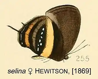 - Thecla selina Hewitson, [1869]: 118, pl.50 fig.255.