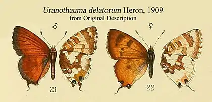- Uranothauma delatorum Heron, 1909: 161, pl. 5, figs 21, 22; Williams, 2008, Polyommatini 1: 20.