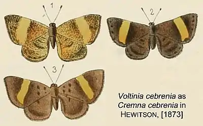 - Cremna cebrenia Hewitson, [1873]: text, pl.37, figs 1-3.