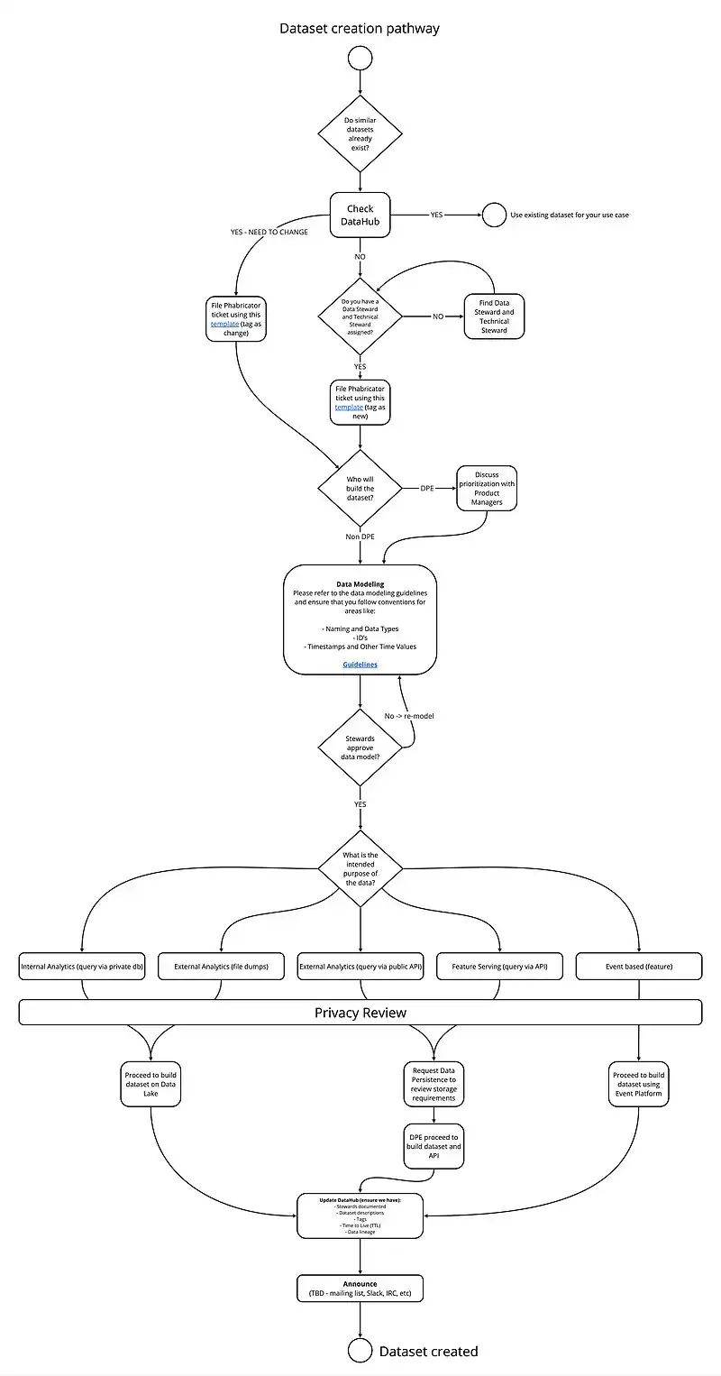 The following flow diagram shows the pathway for WMF employees to create or modify existing datasets.
