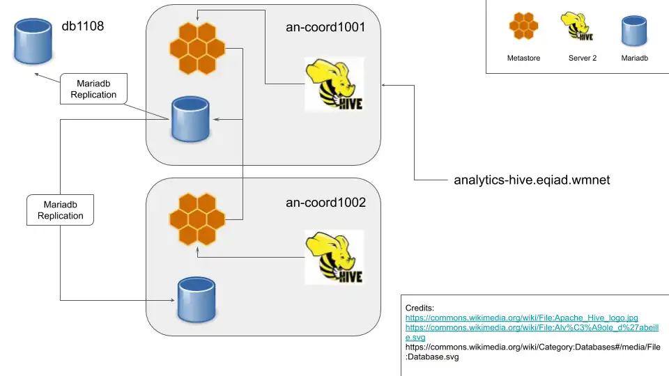 The Hive servers (port 10000) on every coordinators use their local metastore (port 9083) when needed (this is a standard for Hive). The metastores all fetch and store Hive sessions/tokens to the same mariadb database, in this case an-mariadb1001. See Data Engineering/Systems/Analytics Meta for more information on that database and how we are working to achieve high-availbility for it.