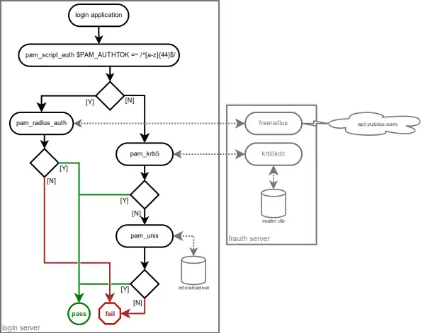 auth [success=ignore default=1] pam_exec.so expose_authtok quiet /usr/local/bin/yubikey_otp_filter auth [success=3 default=2] pam_radius_auth.so auth [success=2 default=ignore] pam_krb5.so minimum_uid=500 use_first_pass auth [success=1 default=ignore] pam_unix.so use_first_pass auth requisite pam_deny.so