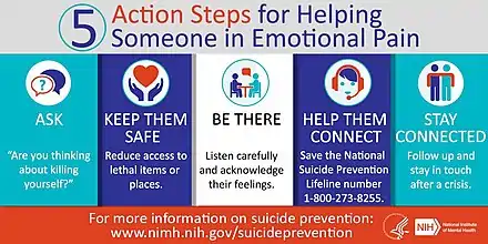 Much evidence supports the focus of treatment on underlying psychopathology.[27] [35] Guidelines for treatment implementation include teaching coping skills to patients and their support team, screening at-risk populations, psychosocial interventions, restriction of means of suicide, and decreased stigma through public awareness.[26] Potential psychotherapy includes talk therapy, psychological counselling, cognitive-behavioral therapy, dialectical behavioral therapy, mindfulness therapy, skills training, medication for comorbid diagnoses, contingency management strategies, relapse prevention plans, specialized care for treatment-resistant depression, and acceptance and commitment therapy.[35] [43] [44] [45]