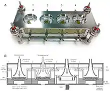 Top view of a module base (lid removed) looking into the four separated wells where cell culture inserts would usually sit and be exposed to tobacco smoke, for an in-vitro study of the effects.
