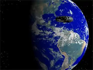 In the Bryce animation example (above) the Starfield sky preset was used with no ground plane. Earth was created as a sphere but the Moon was simply a flat "billboard" object. The space ship is a simple torus.