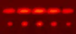 Red light diffracted by two slits (top) and by five slits (bottom)