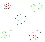 Next, draw a series of dots in the centre in colour A, and a group of colour B dots in the upper right and lower left hand corners. If you only have one colour, different shapes can be used. Now, like before, attempt to draw a single straight line to separate the two.
