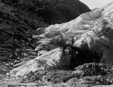 "In 1941, Hole-in-the-Wall Glacier [imaged at the right] surged, also knocking over trees during its advance."[2]